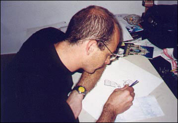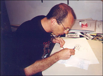 Nesse momento de nosso bate-papo, agradabilíssimo, Lourenço nos mostrou um trabalho que produziu para a Cybercomix, mas que não foi utilizado, no qual revela toda sua versatilidade. São histórias do Pato Camaleão, assinadas por Zigmundo Mussarela (uma “entidade” que ele “recebe por trás”), de um teor agressivo e sarcástico. Nessas pranchas, ele reproduz à perfeição os traços de várias feras das HQs, como Chester Gould (Dick Tracy), Hal Foster (Príncipe Valente), Julio Salinas (Cisco Kid), Hugo Pratt (Corto Maltese), Art Spiegelman (Maus), Charles Schulz (Snoopy), Hergé (Tintin), Alberto Breccia (Mort Cinder), e dos brasileiros Angeli, Fernando Gonzalez, Marcatti e Jô de Oliveira. Ou seja, ele desenha em estilos completamente diversos; em preto e branco e colorido; com desenhos limpos e rebuscados. Como o próprio Lourenço diz, os roteiros não devem ser levados a sério, mas o resultado final do visual das páginas é espantoso, apesar dos personagens principais de cada artista terem recebido bicos de pato!