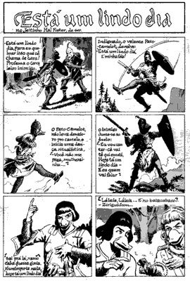 A idéia de concluir a trilogia numa aventura em Portugal pintou lá. Quando eu viajei, faltavam as ultimas dez páginas do Rei do Ponto pra entregar. Eu voltei, concluí o trabalho e comecei a escrever. Eu acho que está legal. O único problema é que percebi que daria pra fazer um quarto volume, mas eu não vou fazer isso. Vou fechar nesse álbum!