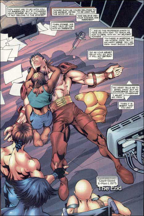 O melhor momento está na última página, onde todo o texto é extraído diretamente do Giant Size X-Men #1, da conversa de Xavier com Colossus e seu pai.