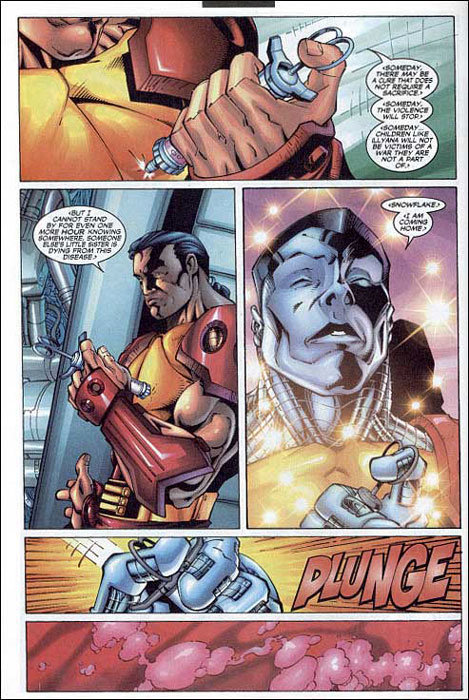 Somos obrigados a agüentar, por páginas a fio, um longo discurso pseudo-científico, onde fica claro que se a vítima inicial contaminada pelo vírus legado morreu propagando o vírus; a cura teria o mesmo efeito e mataria o primeiro a ser inoculado (que bobagem!). Os X-Men, resignados, celebram esse avanço e prometem uma pensar numa solução. Colossus, incapaz de imaginar uma outra pessoa perdendo um parente para o vírus, não espera uma decisão e injeta a vacina em si mesmo.
