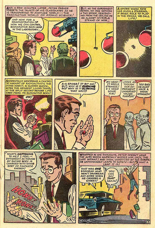 Durante uma visita escolar a um laboratório, Peter Parker é mordido por uma aranha radioativa, que lhe dá superpoderes. Originalmente, o Homem-Aranha podia escalar paredes, tinha superforça, velocidade e agilidade sobre-humana e um sentido de aranha que lhe alertava quando estava em perigo.