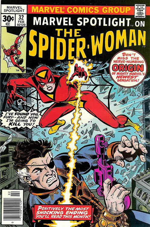 A primeira Mulher-Aranha, Jessica Drew, surgiu em Marvel Spotlight # 32, em 1977, antes de ganhar seu título próprio, em 1978. A personagem foi criada por Archie Goodwin, Sal Buscema e Jim Mooney, com o propósito explícito de proteger o nome e garantir o copyright antes que outras editoras o fizessem.