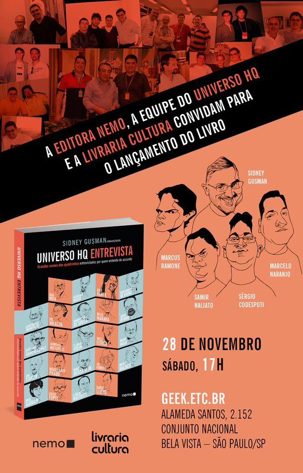 No dia 28 de novembro, sábado, a Editora Nemo, o Universo HQ e a Livraria Cultura promoverão o lançamento de Universo HQ Entrevista – Grandes nomes dos quadrinhos entrevistados por quem entende do assunto, nosso primeiro livro, que reúne 23 das mais importantes entrevistas que realizamos ao longo dos 15 anos de existência do site.