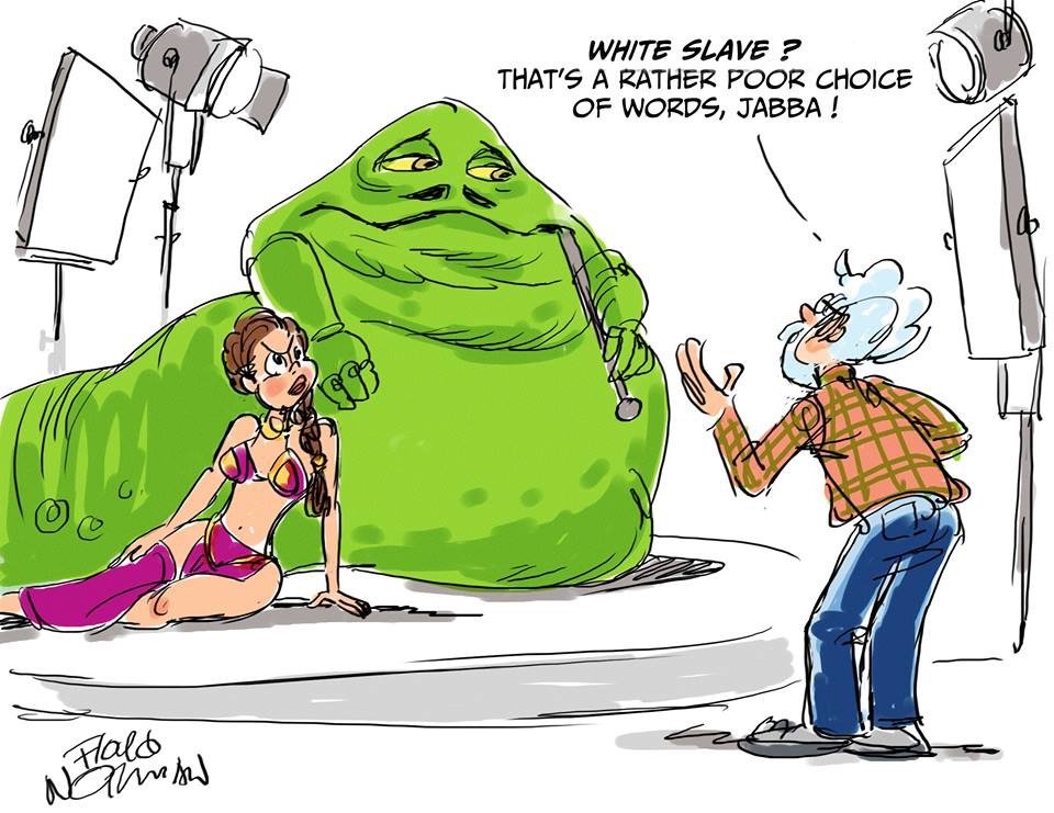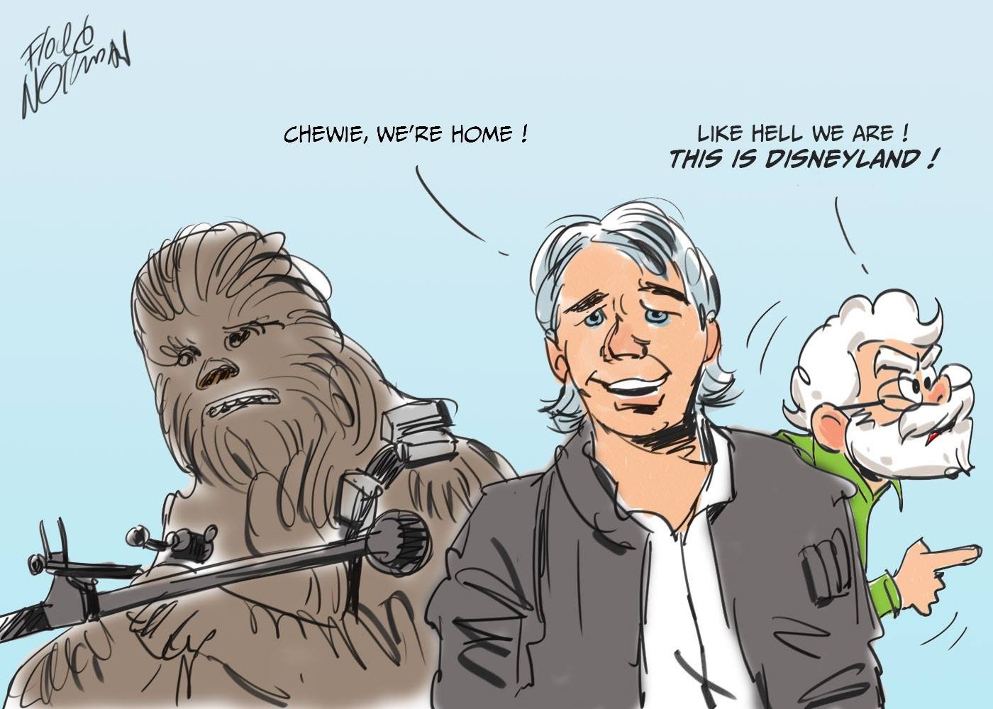 Nas charges, Norman provoca o cineasta George Lucas, que vem dando declarações consideradas como fruto de arrependimento da venda da Lucasfilm para a Disney, inveja do sucesso do novo filme da série Star Wars e recalque pelo fato de a franquia ter seguido forte sem sua participação.