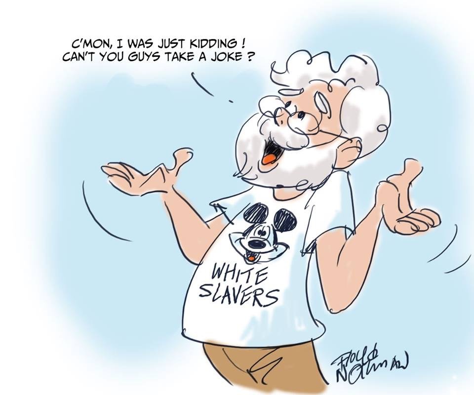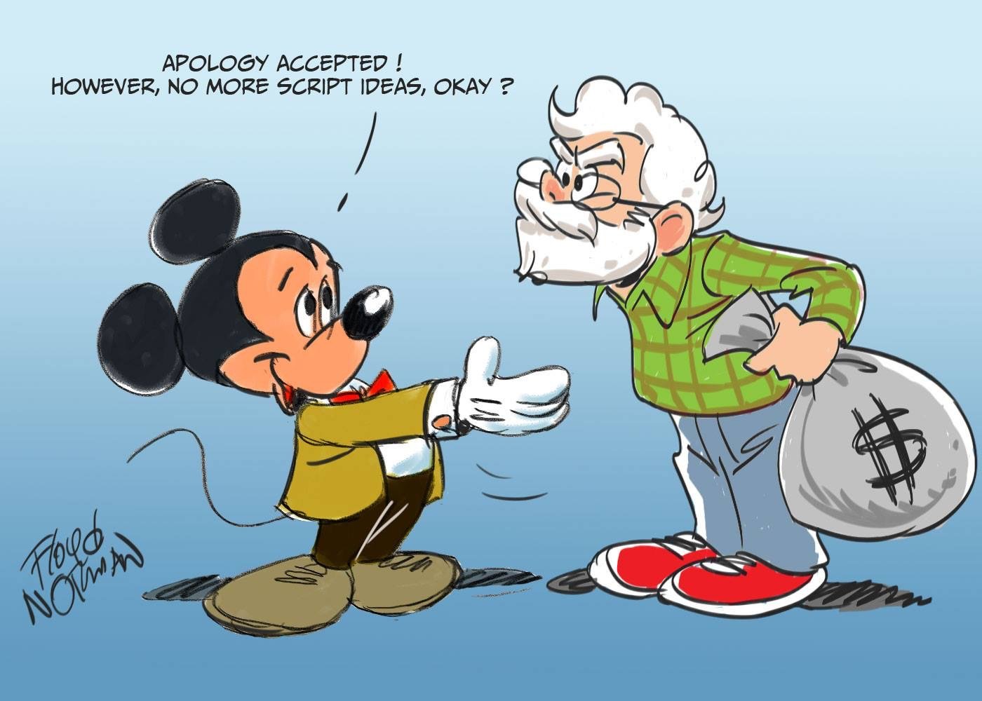 Uma dessas declarações, sobre a Disney ser "dona de escravos brancos", é bastante citada nas charges de Norman. E uma das melhores provocações do cartunista mostra Mickey Mouse sugerindo ao cineasta não dar mais ideias para scripts.