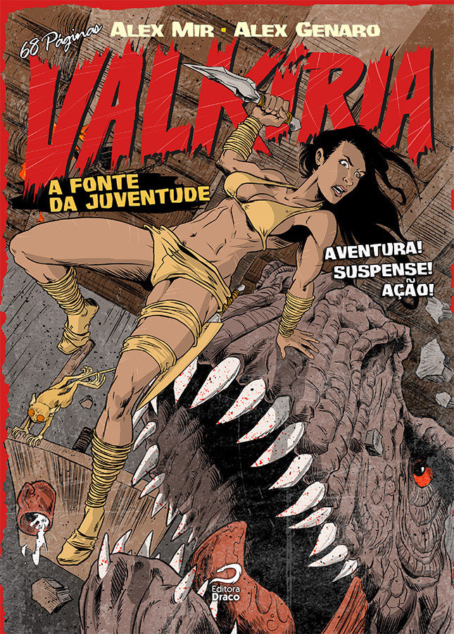Valkíria – Fonte da Juventude (formato 17 x 24 cm, 64 páginas, R$ 24,90), de Alex Mir e Alex Genaro. Valkíria é uma guerreira que vive em uma terra onde a brutalidade é a única certeza no dia a dia de humanos e criaturas que a habitam. Junto ao seu fiel companheiro Rama, ela vai encarar diversos desafios, como encontrar a famosa fonte da juventude, enfrentar uma horda de zumbis famintos e destruir os planos de um grupo de terríveis mercadores de escravas. Criada por Alex Mir (Orixás – Do orum ao ayê) e Alex Genaro (A mão e a luva), Valkíria é uma jungle girl que homenageia personagens que inspiraram gerações de leitores de quadrinhos.