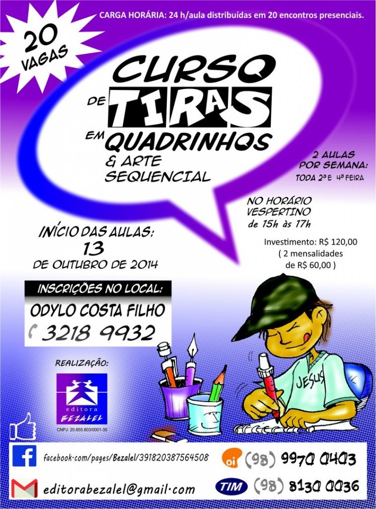 O Centro de Criatividade Odylo Costa Filho (Reviver, ao lado do Shopping do Cidadão, próximo ao Terminal de Integração da Praia Grande, no Centro), em São Luís/MA, oferece 20 vagas para o Curso de tiras de quadrinhos e arte sequencial, que começa no dia 13 de outubro.