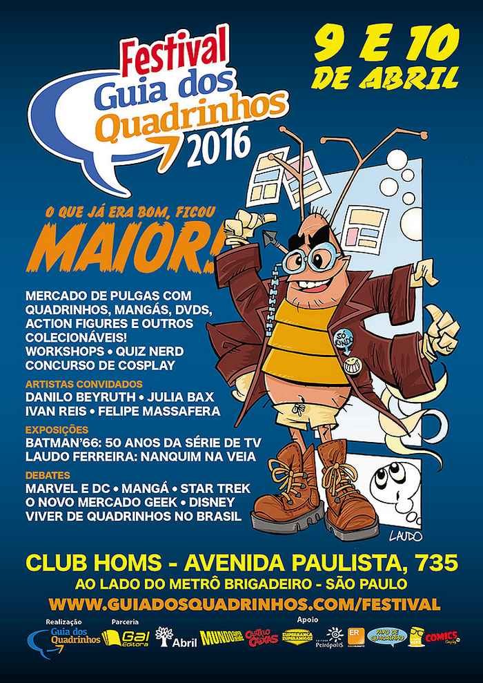 Organizado por Edson Diogo, designer gráfico e criador do site Guia dos Quadrinhos, e pelo jornalista Maurício Muniz, especializado em cultura pop, o Festival Guia dos Quadrinhos 2016 será realizado no Club Homs (Avenida Paulista, 735) nos dias 9 e 10 de abril, próximo ao Metrô Brigadeiro, em São Paulo/SP.