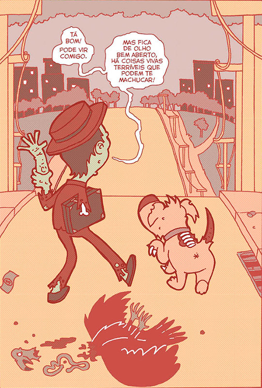 Entardecer dos mortos, por Tiago Holsi – A trajetória de Romeu Homero, zumbi vendedor de sabonetes. Romeu vê sua pacata rotina abalada quando Timbete, um simpático cachorro morto, começa a acompanhá-lo. Os dois vão parar em um parque de diversões em que conhecem a vidente Madame Topanga, que revela a eles que o futuro aguarda grandes surpresas e Romeu irá conhecer o amor de sua vida, quer dizer, de sua morte. Para outros detalhes, recompensas e colaborar, clique aqui.
