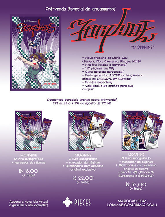 A nova graphic novel nacional de Mario Cau, Morphine (veja detalhes aqui e aqui), já está em pré-venda pelo site oficial do autor. Essa pré-venda acontecerá até o próximo dia 24 de agosto e quem adquirir a edição nesse período terá um desconto na obra. O envio acontecerá antes do lançamento oficial, na Gibicon, em setembro.