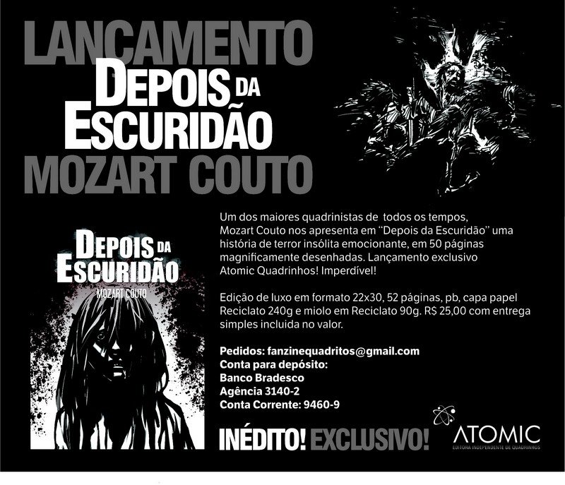 O selo Atomic, de Marcos Freitas, responsável pelo fanzine Quadritos, acaba de lançar o álbum Depois da Escuridão (formato 22 x 30 cm, 48 páginas, R$ 25,00 com frete incluso).
