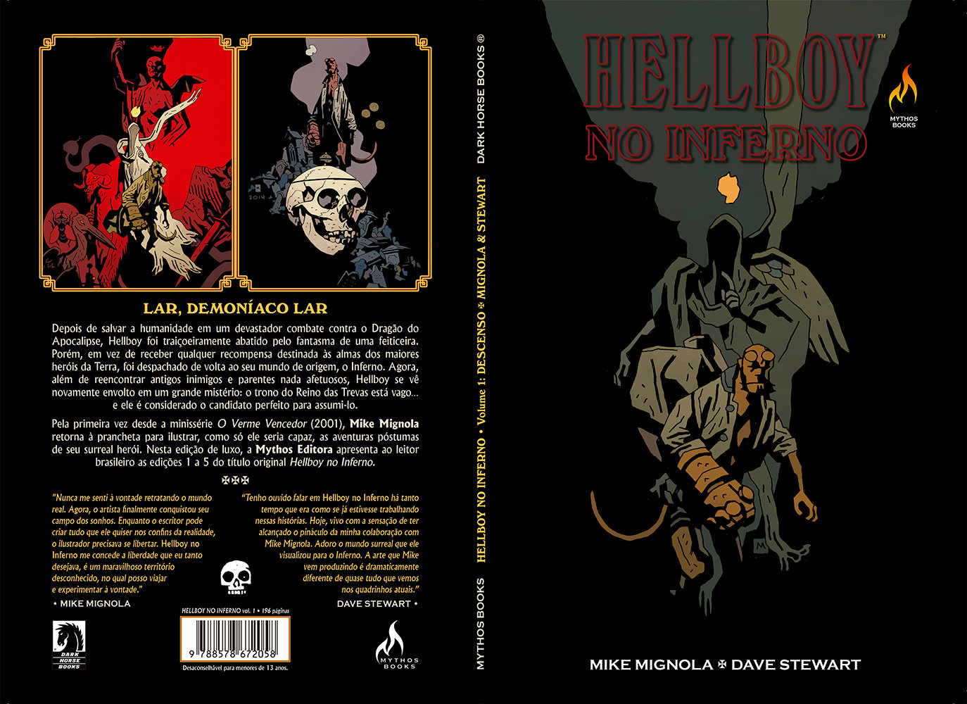 Hellboy no Inferno - Volume 1 - Descenso (formato 17 x 26 cm, 192 páginas, capa dura, R$ 59,90) traz uma aventura inédita do personagem, com eventos posteriores à sua morte, ocorrida no especial Hellboy - Tormenta e Fúria, publicado pela própria Mythos no último mês de março.