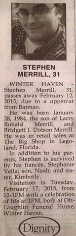 Segundo a ABC News, a família de Merrill ainda não sabia a causa do óbito até a data do envio do texto do obituário ao jornal. Por sugestão de um amigo, o jeito foi apelar para uma peculiar e não menos bizarra solução, bem ao gosto de Stephen: ele morreu ao levar do Batman um "soco direto no queixo".