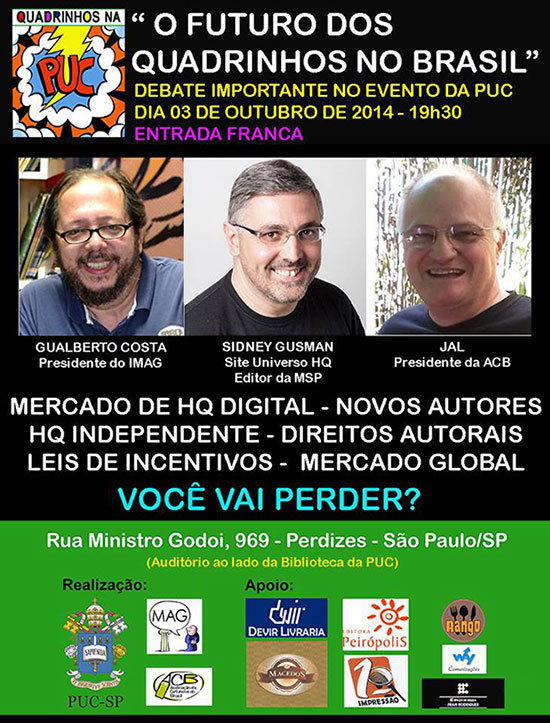 Com a participação de Sidney Gusman, editor-chefe do Universo HQ e editor de projetos especiais da Mauricio de Sousa Produções; Gualberto Costa, presidente do Instituto Memorial das Artes Gráficas do Brasil; e José Alberto Lovetro (JAL), presidente da Associação dos Cartunistas do Brasil, o debate coloca em pauta as possibilidades e o futuro do mercado de quadrinhos no País.