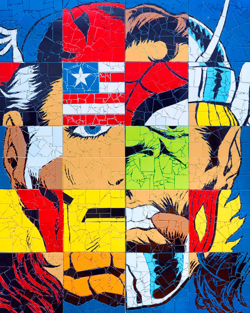A maioria deles é composta pelos super-heróis Marvel e DC - Superman, Mulher-Maravilha, Hulk e outros -, em painéis de tamanhos variados, utilizando, além da cerâmica, tinta, resina, madeira e vinil.