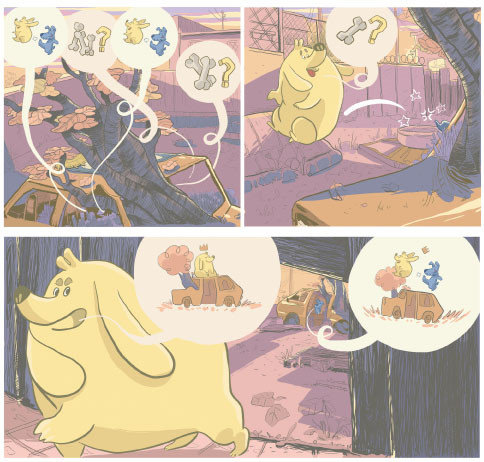 Com uma diagramação funcional e leve (sem delinear os requadros), que ressalta o ritmo da história, a bela arte da dupla ganha reforço com as bem cuidadas cores. Quando Bidu chega ao ápice do seu “dia de cão”, as matizes cinza da chuva evidenciam mais ainda o mundo desolador. Um grande e desolador mundo em uma bela página dupla.