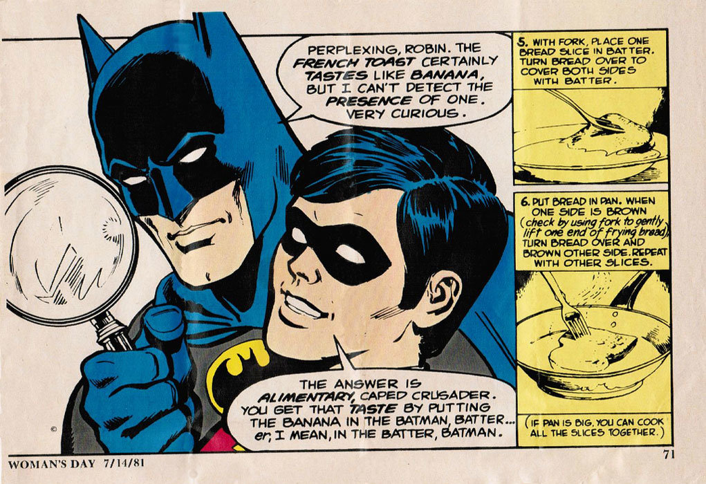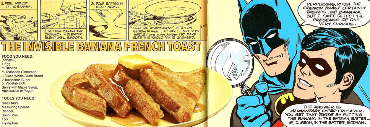 Essas imagens são de um livro de receitas para crianças, lançado nos Estados Unidos em 1981. Na página dupla, que mostra como se fazer uma espécie de banana em forma de torrada (ou seria torrada de banana?), Batman e Robin travam o seguinte diálogo: