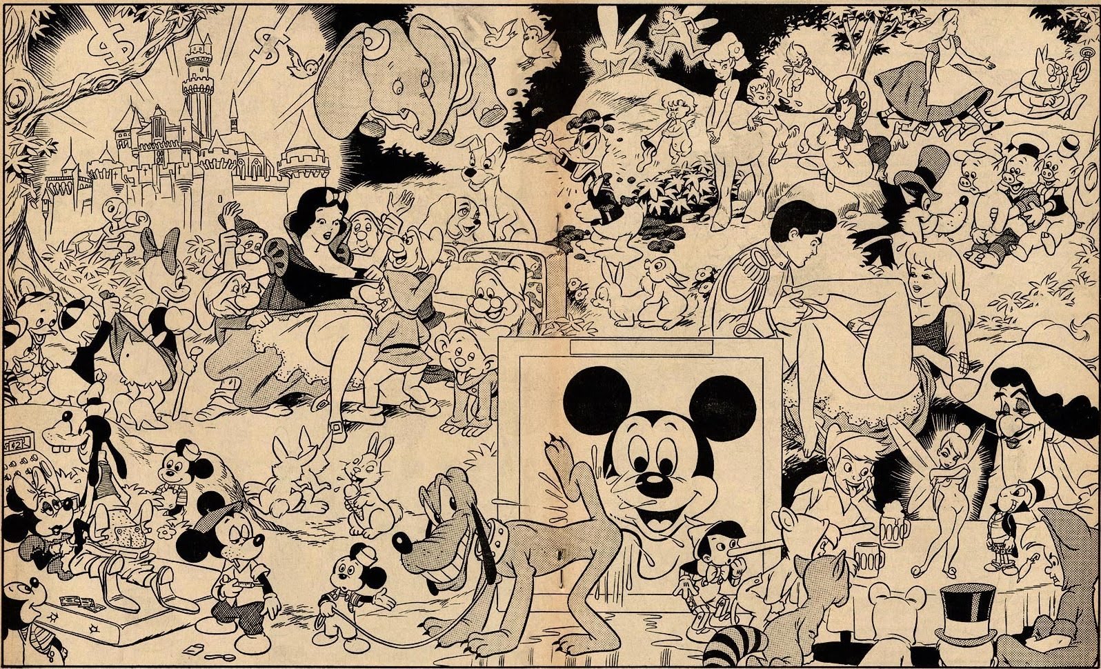 Em 1967, o ilustrador Wally Wood, da revista Mad norte-americana, produziu esse painel intitulado Disneyland Memorial Orgy.
